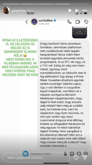 – írta Insta-sztorijában Bea asszony, majd megmutatta azt az üzenetet is, amit Curtisnek privátban is elküldött.