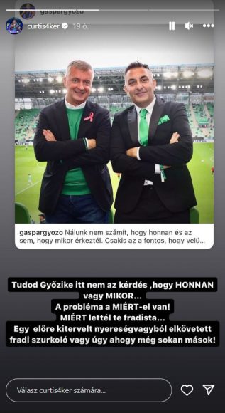 Curtis nem tudta szó nélkül hagyni a Gáspár család körül kialakult botrányt, amit a debreceni drukkerek okoztak a Fradi-Loki meccsen azzal, hogy lecigányozták, illetve fideszes g*cinek nevezték Győzikét.