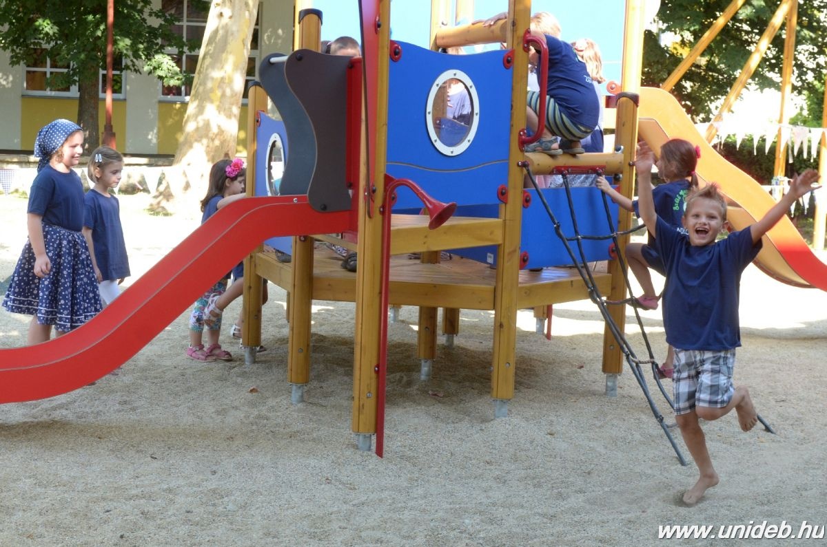 – Ezeknek a helyére kaptunk lehetőséget, hogy egy új játszóteret tervezzünk. A Debreceni Egyetem Gyermeknevelési és Felnőttképzési Kara, a Kancellária, valamint az intézmény Hallgatói Önkormányzata 5-5 millió forinttal támogatta az elképzeléseinket, így összesen 15 millió forintból tudtunk gazdálkodni – mondta el Gellén Sándorné óvodavezető a játszótér csütörtöki átadó ünnepségén.