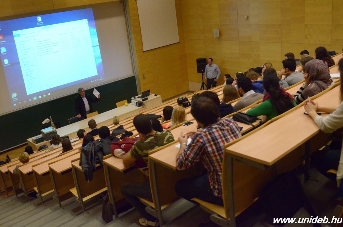 Az Élettudományi épület előadójában tartott tájékoztatón a városról, az egyetemről hallhattak fontos információkat a diákok, de hasznos ismereteket szerezhettek a tanórákról, a könyvtárról, az egyetemi életről, a szabadidős sport- és szórakozási lehetőségekről, egyszóval mindarról, ami segítheti a gyors beilleszkedést.