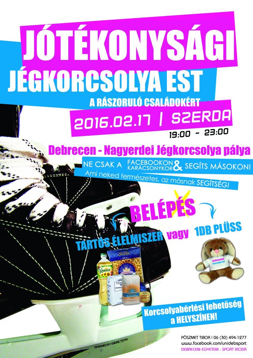 Nem csak karácsonykor kell odafigyelni a hátrányos helyzetű családokra! Ezzel a mottóval rendez idén jótékonysági korcsolya estet február 17-én, szerdán 19 órától a Nagyerdei Stadion előtti jégpályán a Debreceni Egyetem Sportirodája.
