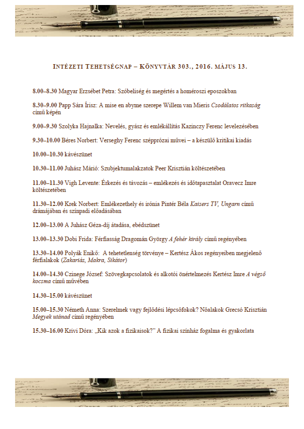 Az Irodalom- és Kultúratudományi Intézet tehetségnapján kiemelkedő hallgatók mutatják be szakdolgozati témáikat, kutatásaikat május 13-án 8:00 órától a Főépületben a harmadik emeleti (303.) könyvtárban. A rendezvényen átadják az intézet Juhász Géza-Díját is.Az esemény facebookos oldala