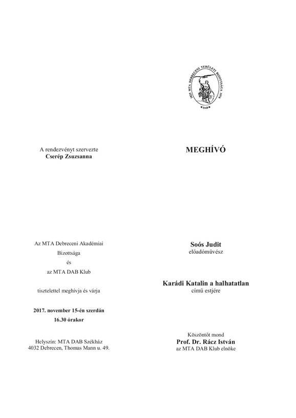 Karádi Katalin est lesz a DAB Klubban Egyetem Kultúra november 7, 2017Szabolcs SzilágyiSzóljon hozzá a Karádi Katalin est lesz a DAB Klubban bejegyzéshez Közreműködik: Soós Judit előadóművész.