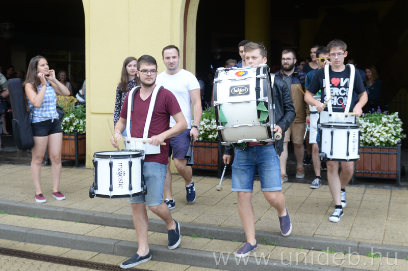 Nem tántorította el az eső a Kodály Zoltán Ifjúsági Világzenekar vonós, ütős és fúvós kamaraegyütteseit, elsőként az Kossuth-téri árkádok alatt, majd a Nagytemplom előtt zenéltek vasárnap kora este. A fiatalok könnyed zeneművekkel, saját koreográfiákkal üdvözölték az arra sétálókat.