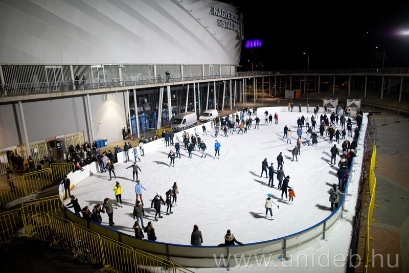 Ezúttal belépő nélkül lehetett használni a Nagyerdei Stadion északi rendezvényterén felállított jégpályát, ám ehhez minden látogatónak valamilyen tartós élelmiszert kellett leadnia a bejáratnál.