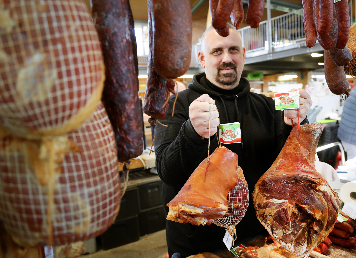 Képen: Kothencz Tibor algyői húsfeldolgozó kistermelő standja a Mars téri piacon.