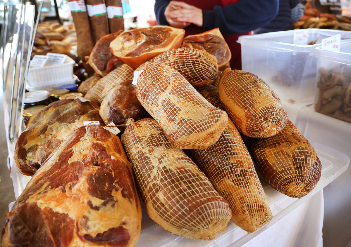 Szeged, sonka körkép húsvét előtt a Mars téri piacon.