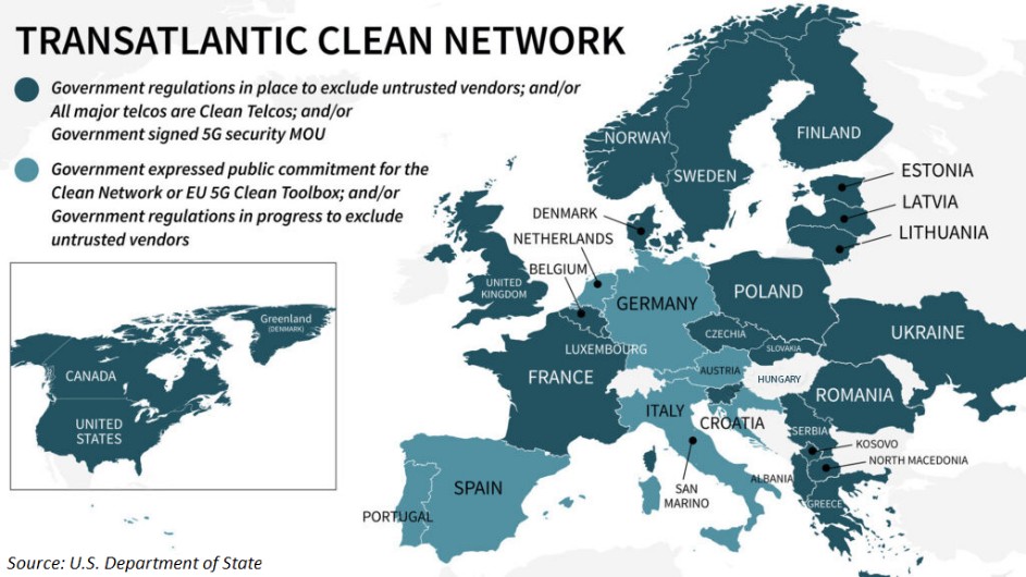 Az EU erőfeszítéseivel párhuzamosan a legtöbb európai NATO-tagállam csatlakozott az amerikai külügyi tárca, a Department of State Transatlantic Clean Network kezdeményezéséhez is, és vagy már hozott olyan döntéseket és jogszabályokat, amelyek keretében kizárták a hálózataikból a nem megbízhatónak ítélt beszállítókat, vagy folyamatban vannak az erre irányuló döntések.