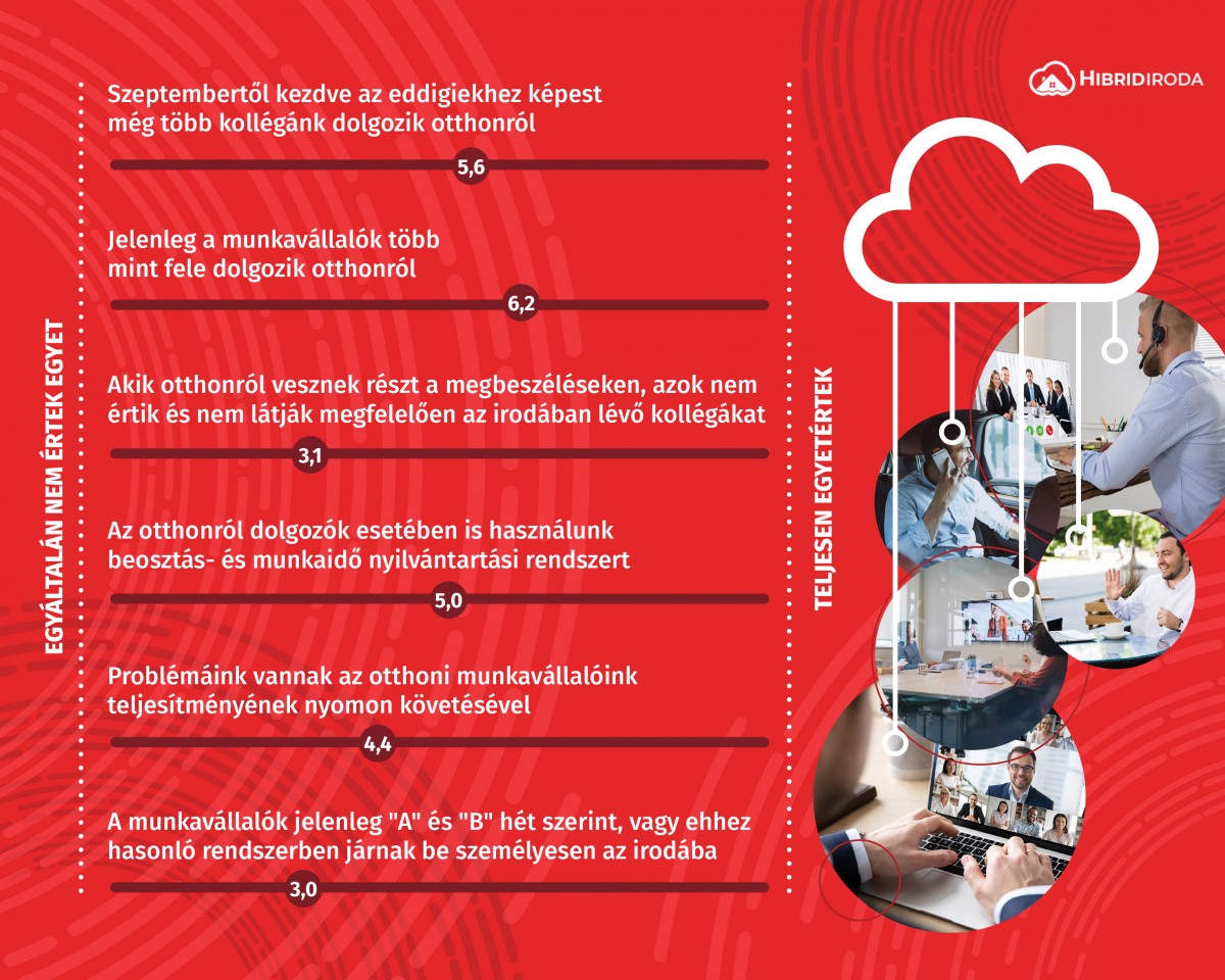 Az országszerte több mint 250 vállalati ügyféllel rendelkező Infosector kutatásában cégvezetők válaszait gyűjtötték össze a második hullámban tapasztaltakról és a pandémia által okozott kihívások kezeléséről. A hat pontból álló kérdőívben a megkérdezetteknek egy tízes skálán kellett értékelniük az állításokat azok alapján, hogy mennyire igaz cégükre az adott kijelentés. Az első kérdésre adott válaszok alapján kijelenthető (5,6-os átlag), hogy habár voltak kiugró esetek, összességében szeptembertől kezdve nem nőtt számottevően az otthonról dolgozók száma az első hullámhoz képest. A cégvezetők többsége egyúttal arra is rámutatott, hogy munkavállalóik több mint fele dolgozik huzamosabb ideje otthonról (6,2-es átlag), és a vállalkozása idei eredményére kiemelkedő hatással van az otthoni munkavállalók teljesítménye.