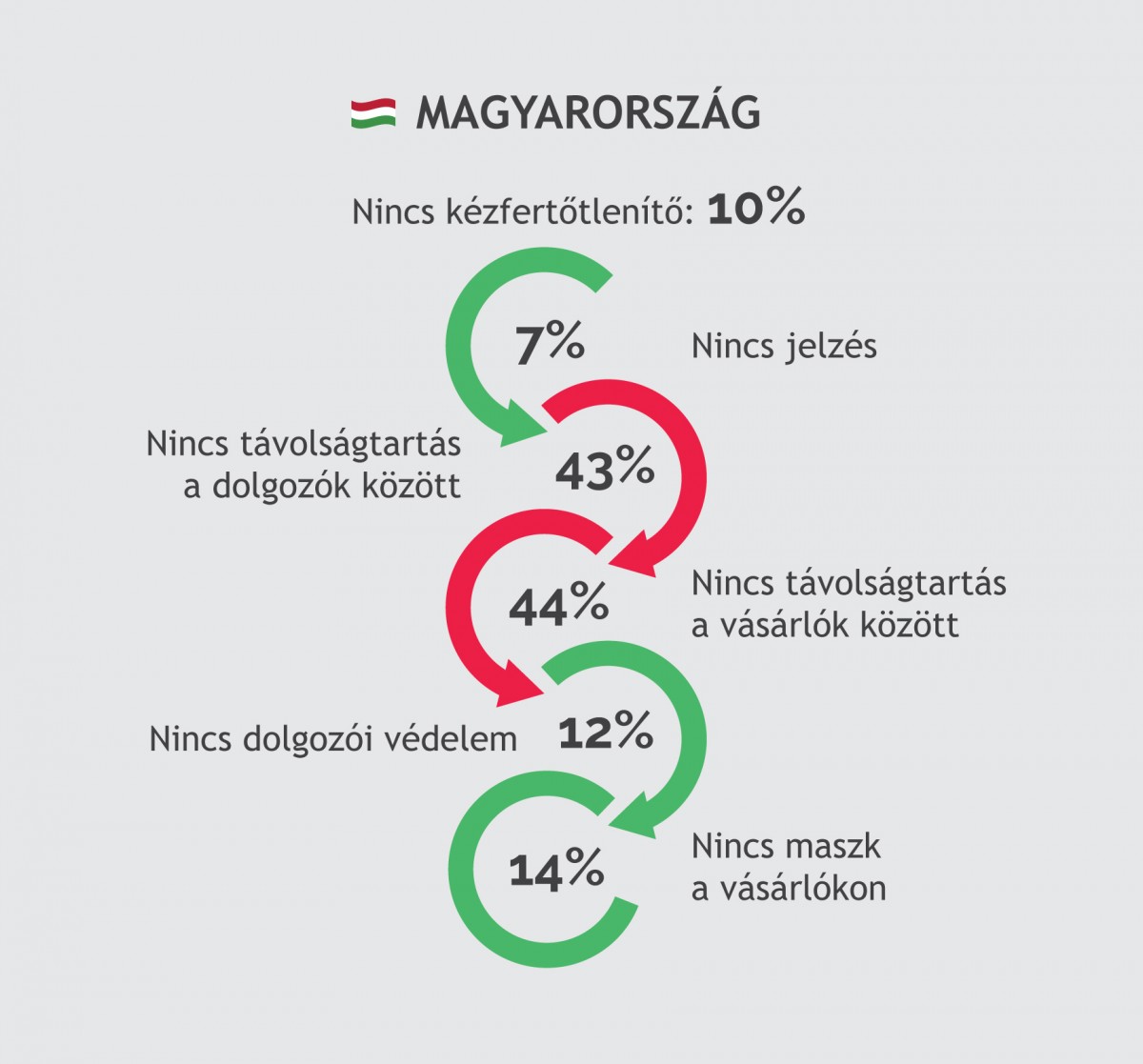 A magyar eredményeket tekintve a kézfertőtlenítők kihelyezését 10%-ban tartották problémának, vagyis a felmérésben szereplő minden tizedik üzletnél hiányzott. A dolgozói védelem 12%-os mutatója is fejlesztendő, de ebben például jobban teljesítünk az európai átlagnál (14%). A maszkviselésben kifejezetten jól szerepeltünk, hiszen szemben az európai 25%-kal, ahol minden negyedik üzletben találtak hiányosságokat, nálunk ez csak a boltok 14%-ára mondható el.