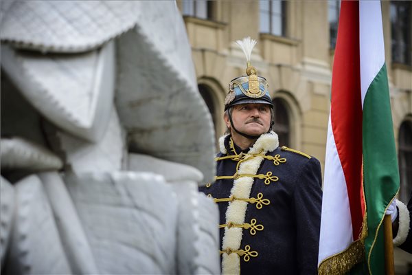 Egy hagyományőrző huszár az 1956-os forradalom és szabadságharc tiszteletére szervezett ünnepi megemlékezésen Debrecenben, az Egyetem téren 2014. október 23-án. MTI Fotó: Czeglédi Zsolt