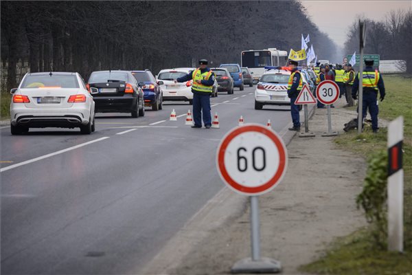Félpályás útlezárás a Liga Szakszervezetek forgalomlassító demonstrációján Debrecen határában, a 4-es főúton 2014. december 15-én. A Liga demonstrációin a tervek szerint az ország 62 pontján legalább 1600 gépkocsi lassítja a közúti forgalmat reggel 7 és délután 4 óra között. A tiltakozók álláspontja szerint a kormány intézkedései hátrányosan érintik a munkavállalókat. MTI, fotó: Czeglédi Zsolt