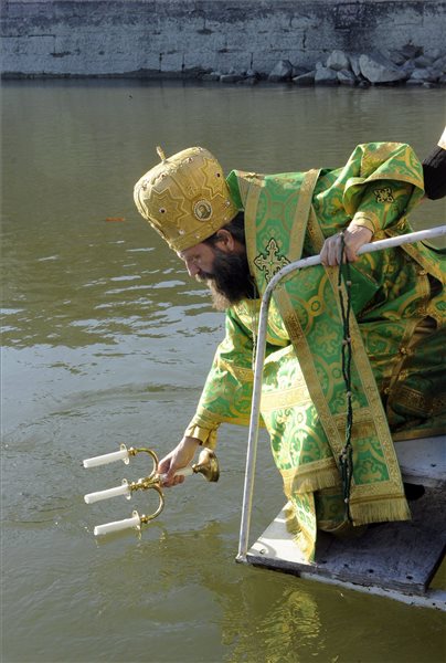 ocsis Fülöp hajdúdorogi görög katolikus püspök vízkereszt alkalmából ősi keresztény szokás szerint megszenteli a Duna vizét a Batthyány téri Duna-parton 2015. január 6-án. MTI, fotó: Czimbal Gyula