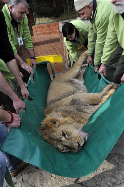 Szimbát, a 2013. április 14-én született hím oroszlánt állatorvosi vizsgálat után elaltatott állapotban viszik a Fővárosi Állat- és Növénykertben 2015. március 25-én. Az állatot két másik oroszlánnal a Debreceni Állat- és Növénykertbe szállítják. MTI Fotó: Kovács Attila