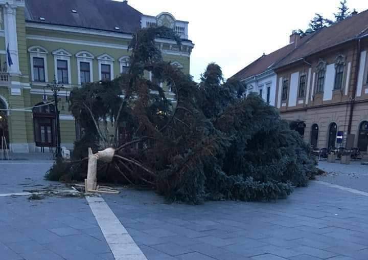 Eger karácsonyfája máris eldőlt. Megadta magát a kedd hajnali viharos szélnek a város karácsonyfája a Dobó téren. Szerencsére senki nem sérült meg amikor a 12 méter magas, több mint 3 tonnás fa eldőlt – írja az egerhirek.hu