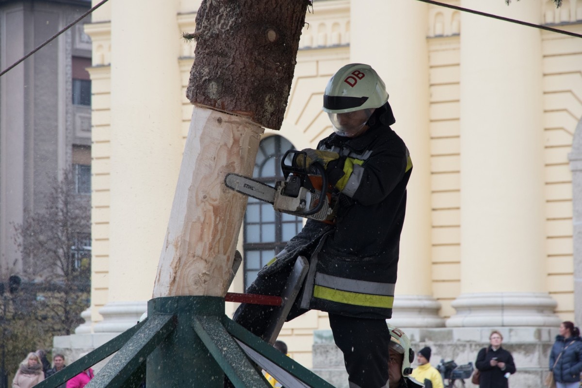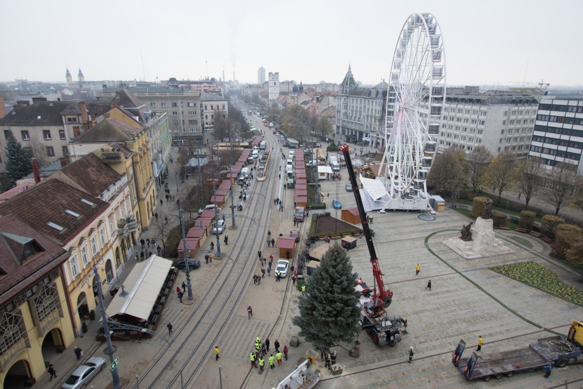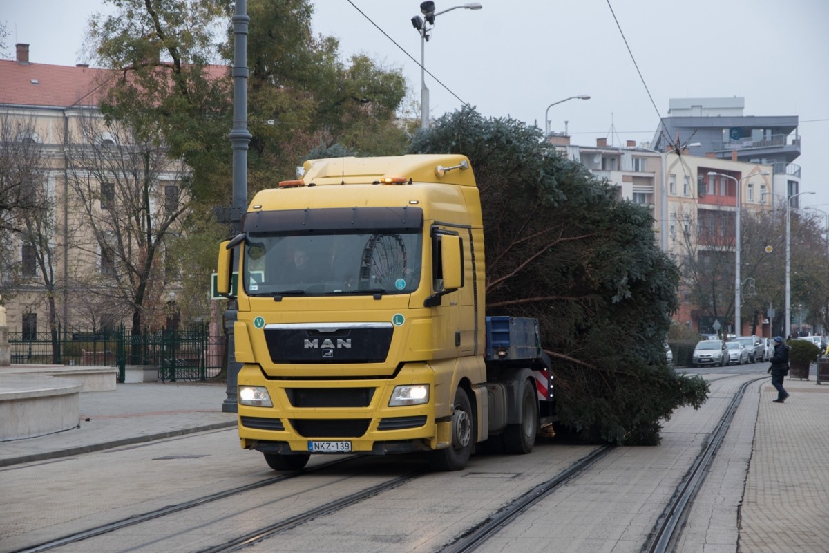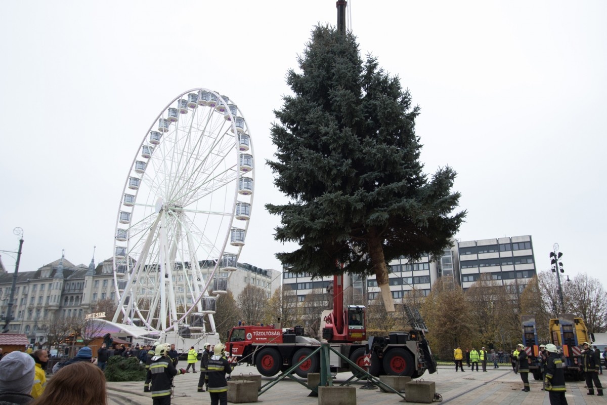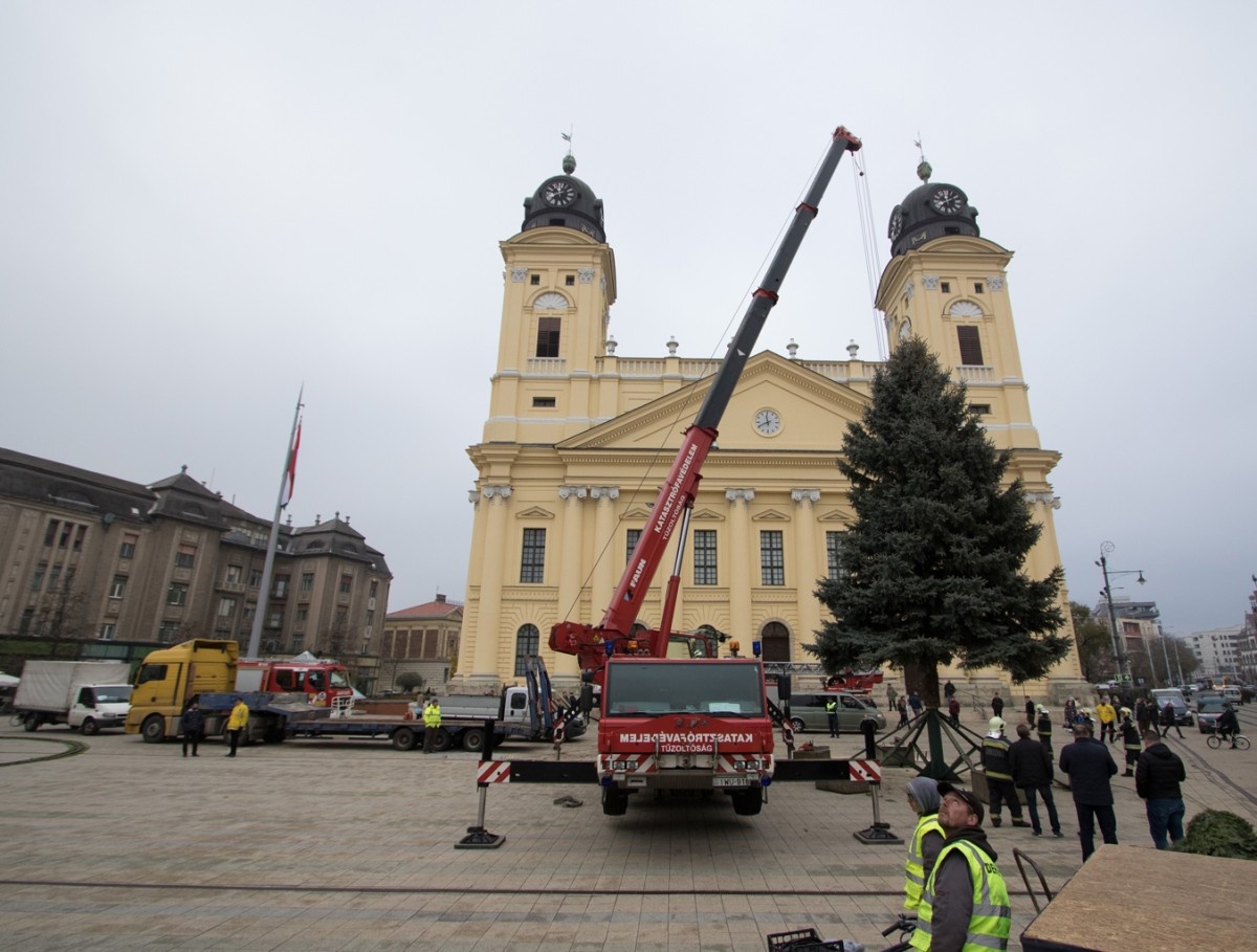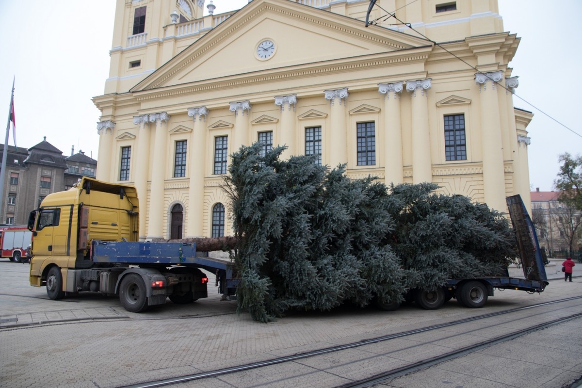 Debrecen karácsonyfáját 2018. november 23-án állították fel a Nagytemplom előtt, a Kossuth téren.