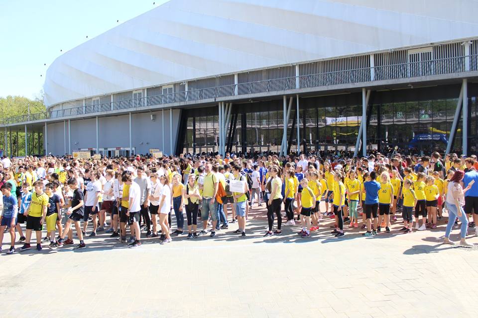 A résztvevők a Debreceni Nagyerdei Stadion körül futnak egy kört a program szimbólumát kifejező sárga pólóban.