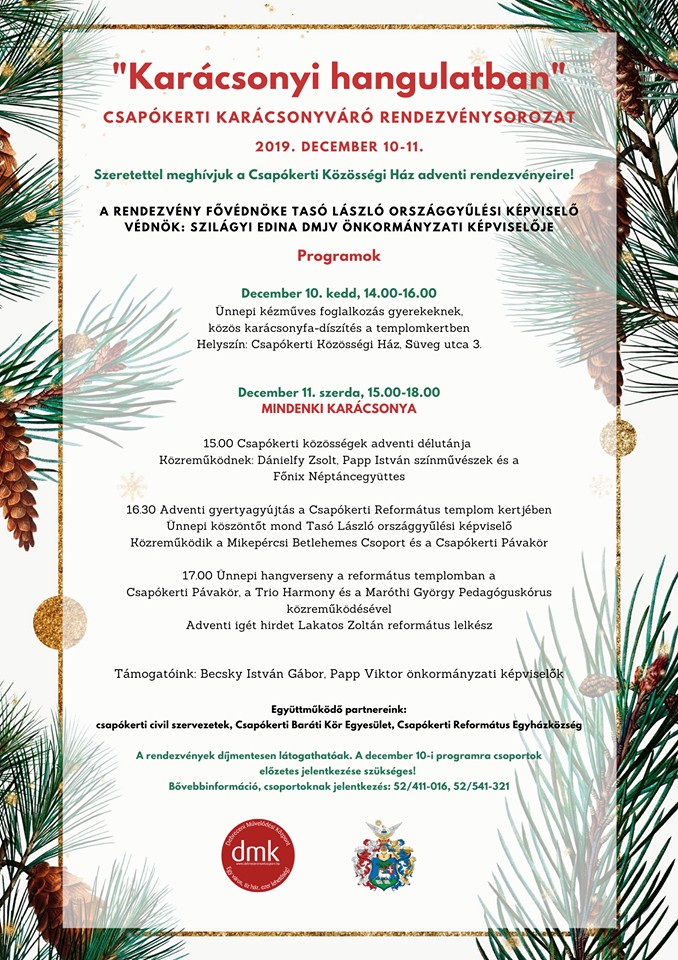 Karácsonyváró lesz a Csapókerti Közösségi Házban Helyi hírek december 10, 2019április 12, 2024Szabolcs SzilágyiSzóljon hozzá a Karácsonyváró lesz a Csapókerti Közösségi Házban bejegyzéshez Várják az érdeklődőket.