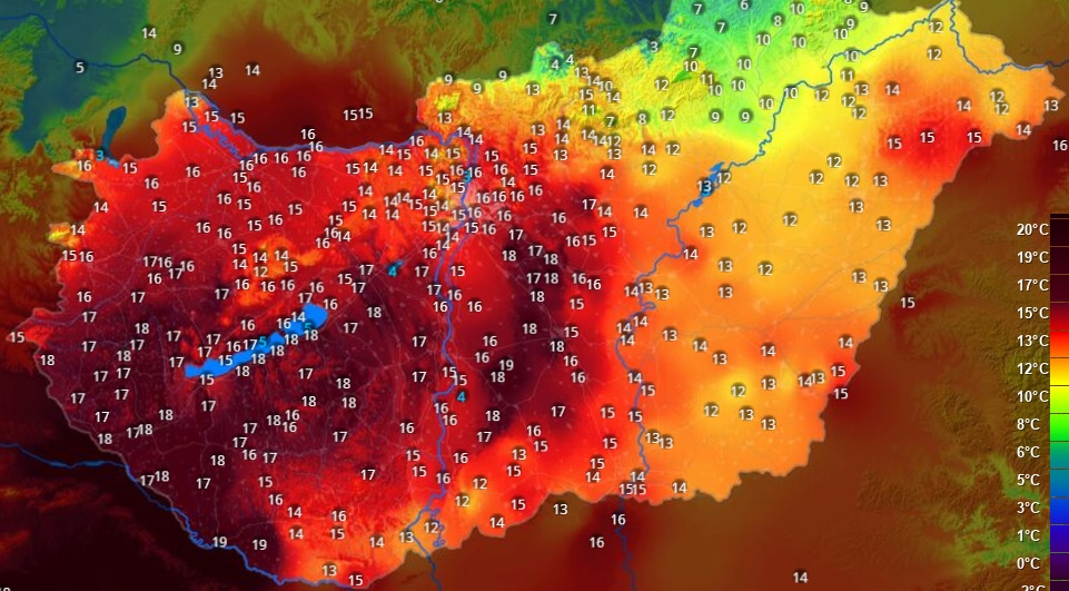 Az Időkép hőtérképe szerint a legmelegebb délnyugaton van, itt közel 20 fokot mérnek: