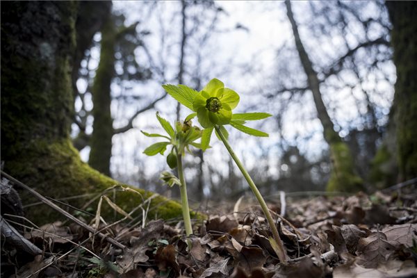 Virágzó illatos hunyor (Helleborus odorus) Pécs közelében, a Mecsekben 2020. február 5-én. A védett virág eszmei értéke tízezer forint. MTI/Sóki Tamás