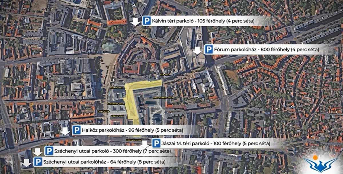 Emellett az autósok használhatják az Igazságügyi tömb alatti, valamint a Halköz üzletház alatti parkolóházat, a Kálvin téri parkolókat, a Fórum Debrecen parkolóházát vagy a Jászai Mari téri parkolót. Gyalogosan az összes lakóház és üzlet megközelíthető marad.