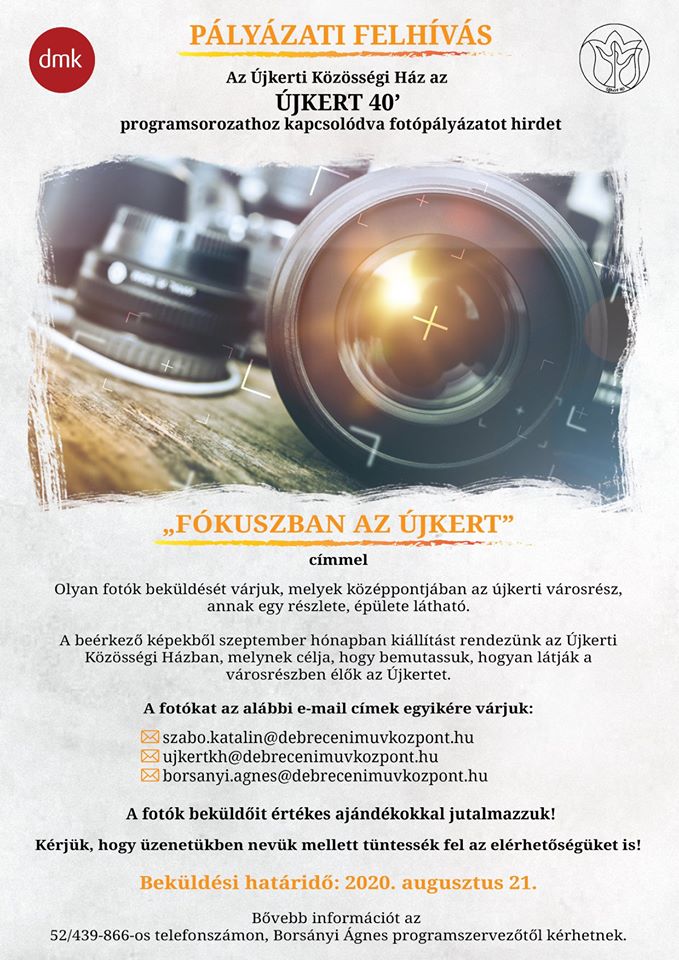 Az Újkerti Közösségi Ház az Újkert 40 programsorozat keretén belül pályázatot hirdet „Fókuszban az Újkert” címmel. A zsűri tagjai olyan fotók beküldését várják, amelyek középpontjában az újkerti városrész, annak egy részlete, épülete látható. A beérkezett képeket szeptemberben az intézmény kiállítás formájában kívánja az érdeklődők szeme elé tárni, hogy bemutathassák, hogyan látják a városrészben élők az Újkertet. A fotókat augusztus 21-ig várják.