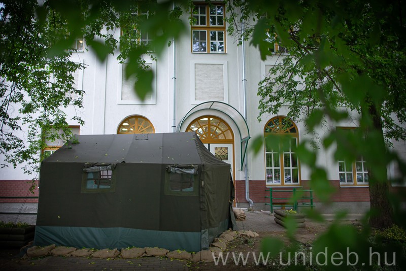 Katonai sátorban végzik a szakrendelésekre érkezők előszűrését a Debreceni Egyetem Klinikai Központ Gyermekgyógyászati Klinikájánál is. A gyermekek és kísérőik a lázmérés és a kikérdezés után csak maszkban és kézfertőtlenítést követően léphetnek be az épültbe.