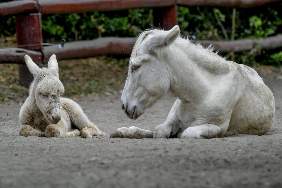 A Debreceni Állat- és Növénykert szeptember 10-én született fehér szamárcsikója anyja mellett a sajtóbemutató napján, 2020. szeptember 24-én. A Hunor névre keresztelt életerős, jó étvágyú kis csődör bő egy év vemhességet követően jött világra. MTI/Czeglédi Zsolt