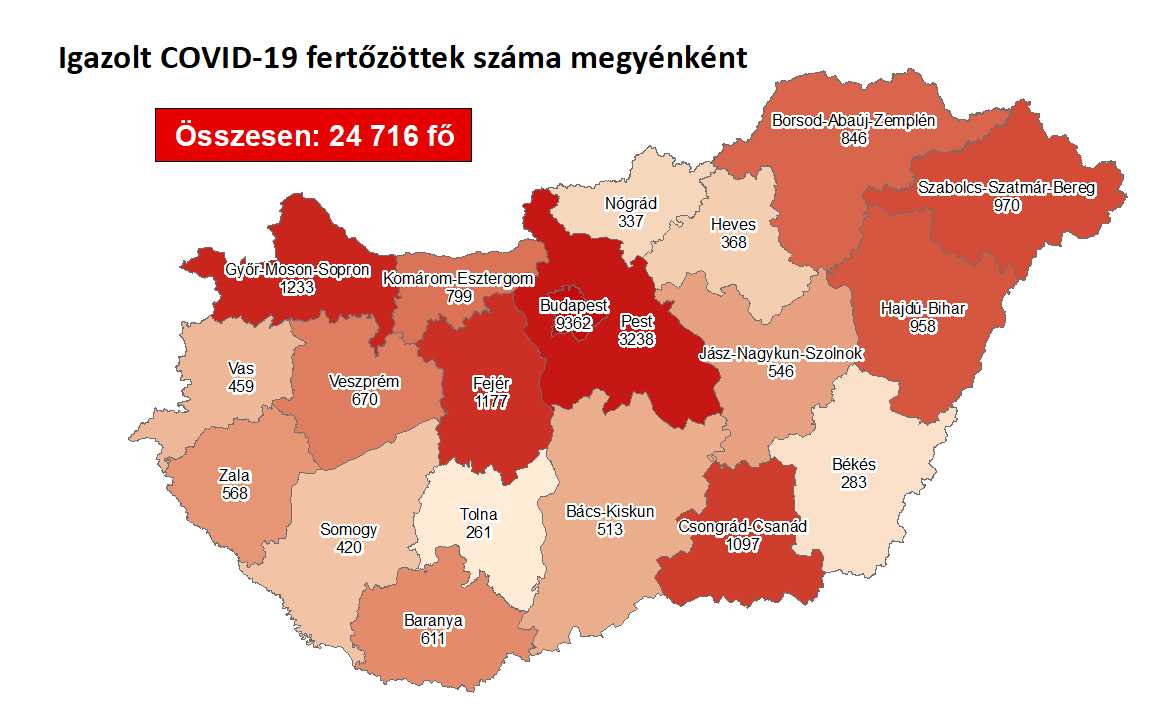 702 újabb magyar állampolgárnál mutatták ki az új koronavírus-fertőzést (COVID-19), ezzel 24 716 főre nőtt a hazánkban beazonosított fertőzöttek száma. Elhunyt 13 beteg, így az elhunytak száma 749 főre emelkedett, 5152-en pedig már meggyógyultak. Az aktív fertőzöttek száma 18 815 fő. Az aktív fertőzöttek 37%-a, az elhunytak 54%-a, a gyógyultak 39%-a budapesti. 693 koronavírusos beteget ápolnak kórházban, közülük 44-en vannak lélegeztetőgépen.