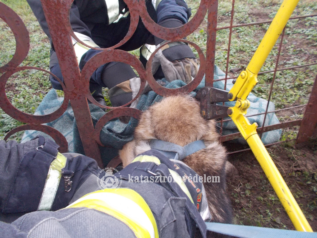 Egy vaskerítés lécei közé szorult egy kutya feje vasárnap reggel Debrecenben, a Cinege utcában. A debreceni hivatásos tűzoltók csapszegvágóval szabadították ki az állatot.
