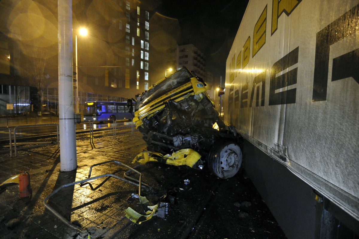 Összeroncsolódott kamion a főváros XIII. kerületében, a Róbert Károly körút Árpád híd felé vezető oldalán 2020. december 23-án.