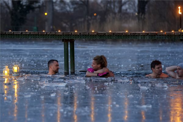 A Hidegvíz Törzs nevű csoport tagjai fürdőznek a Pest megyei Veresegyházi-tóban. A hideg vizes fürdőzés szerelmesei a téli időszakban minden héten felkeresnek egy nyílt vízi területet és megmártóznak a fagyos vízben.