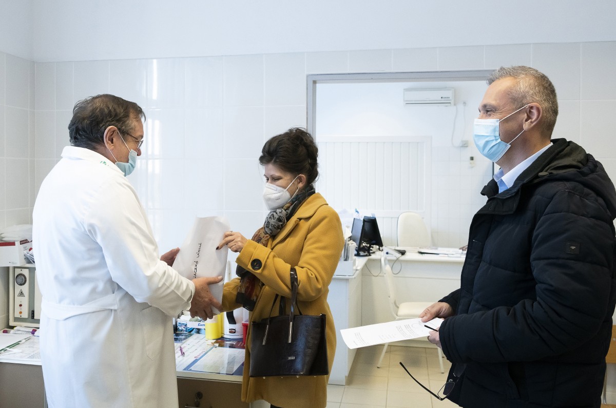 Aratóné Perjési Mariann járási hivatalvezető-helyettes és Elek Tamás járási hivatalvezető átadja Laczkó László belgyógyász-háziorvosnak az AstraZeneca koronavírus elleni vakcináit a tiszadobi rendelőben 2021. március 10-én.