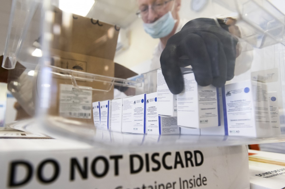 Sándor József klinikai biokémikus, a Központi Laboratórium vezető helyettese a fagyasztószekrény dobozaiba pakolja a Szputnyik V újonnan érkezett, koronavírus elleni vakcinákat tartalmazó dobozokat a Jósa András Oktatókórház Központi Laboratóriumában.ű