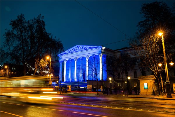 Díszkivilágítás a Magyar Nemzeti Múzeum homlokzatán a görög nemzeti ünnep alkalmából