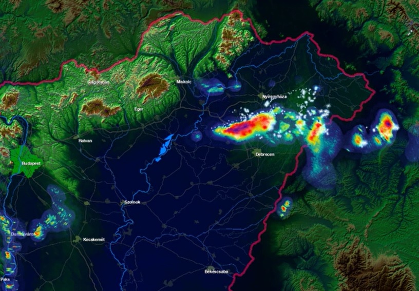 Az ország északkeleti felén egészen markáns zivatargóc alakult ki, az Időkép észlelő szerint Hajdúdorogon jégeső pusztít, de Görbeházán és Hajdúböszörményben is leszakadt az ég.