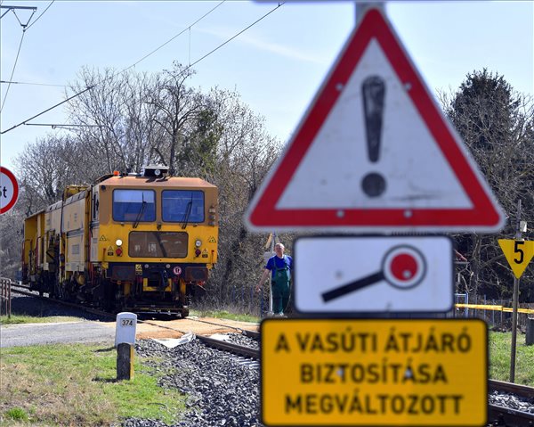 Aláverőgép dolgozik Balatonkenese és Balatonakarattya állomás között a felújítás alatt álló Szabadbattyán-Balatonfüred vasútvonalon 2021. április 1-jén.