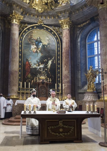 Veres András győri megyés püspök (k) az utolsó vacsorára emlékező nagycsütörtöki misén a győri Nagyboldogasszony-székesegyházban 2021. április 1-jén. Fotó: MTI/Krizsán Csaba