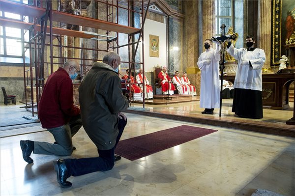 Hívek a nagypénteki szentmisén a győri Nagyboldogasszony-székesegyházban 2021. április 2-án. Fotó: MTI/Krizsán Csaba