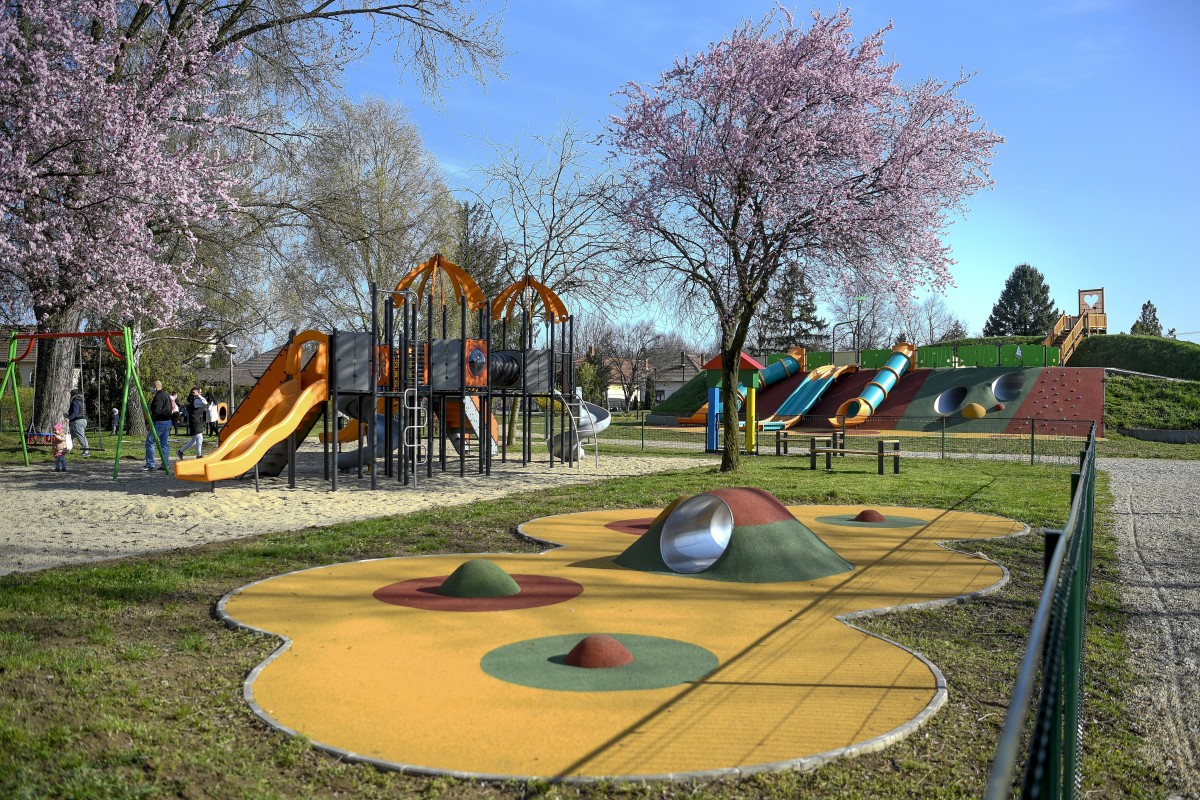 A Városliget közpark Tiszafüreden az ünnepélyes átadása napján, 2021. április 9-én. A parkban a Tisza-tó legnagyobb játszótere készült el, amely több mint 15 játékelemet tartalmaz. Ezen a napon adták át a város megújult főterét is. A több mint félmilliárd forintos beruházás túlnyomórészt a Terület- és Településfejlesztési Operatív Program (TOP) pályázatán elnyert támogatásból valósult meg. A tervek szerint a teljesen új közösségi terület kulturális és idegenforgalmi rendezvények helyszínéül is szolgál majd.Fotó: MTI/Czeglédi Zsolt
