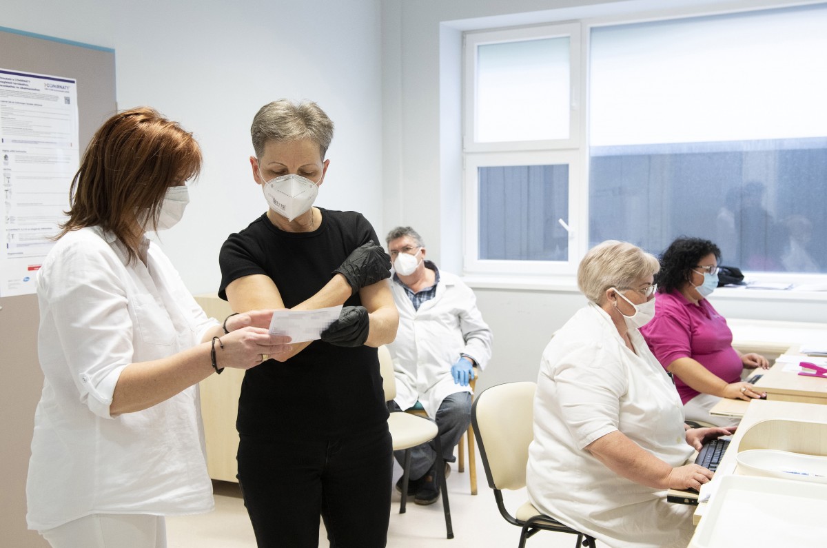 Egy nőnek odaadják az oltást igazoló dokumentumot, miután beoltották az orosz Szputnyik V koronavírus elleni vakcina első adagjával a nyíregyházi Jósa András Oktatókórházban kialakított oltóponton 2021. április 13-án.
