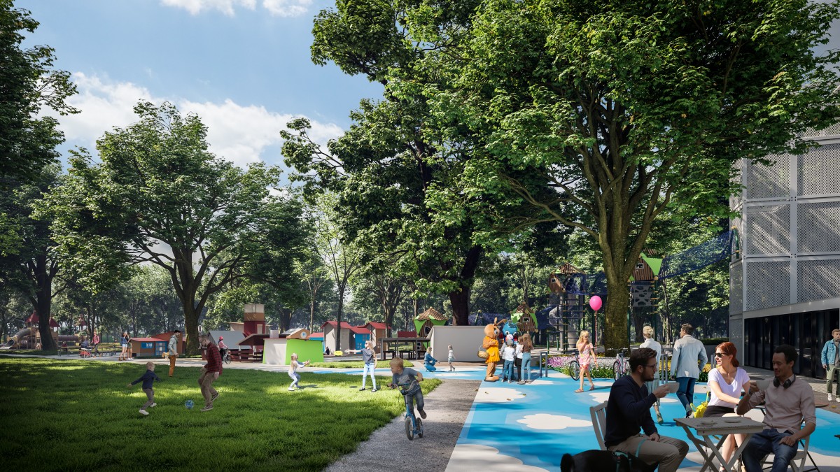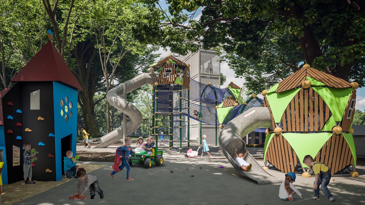 A négyévszakos játszótéren épülő 450 négyzetméteres központi épületben a kávézó és büfé mellett kialakításra kerül egy 30-40 fő befogadására alkalmas rendezvényterem valamint egy baba-mama helyiség is. Az épület hátsó részében kap helyet az úgynevezett élménytorony, egy ötszintes a gyerekek szórakoztatására létesített kilátó, illetve játszótorony – mondta el Széles Diána alpolgármester. A pavilon építése az Európai Uniós pályázat kötelező eleme.