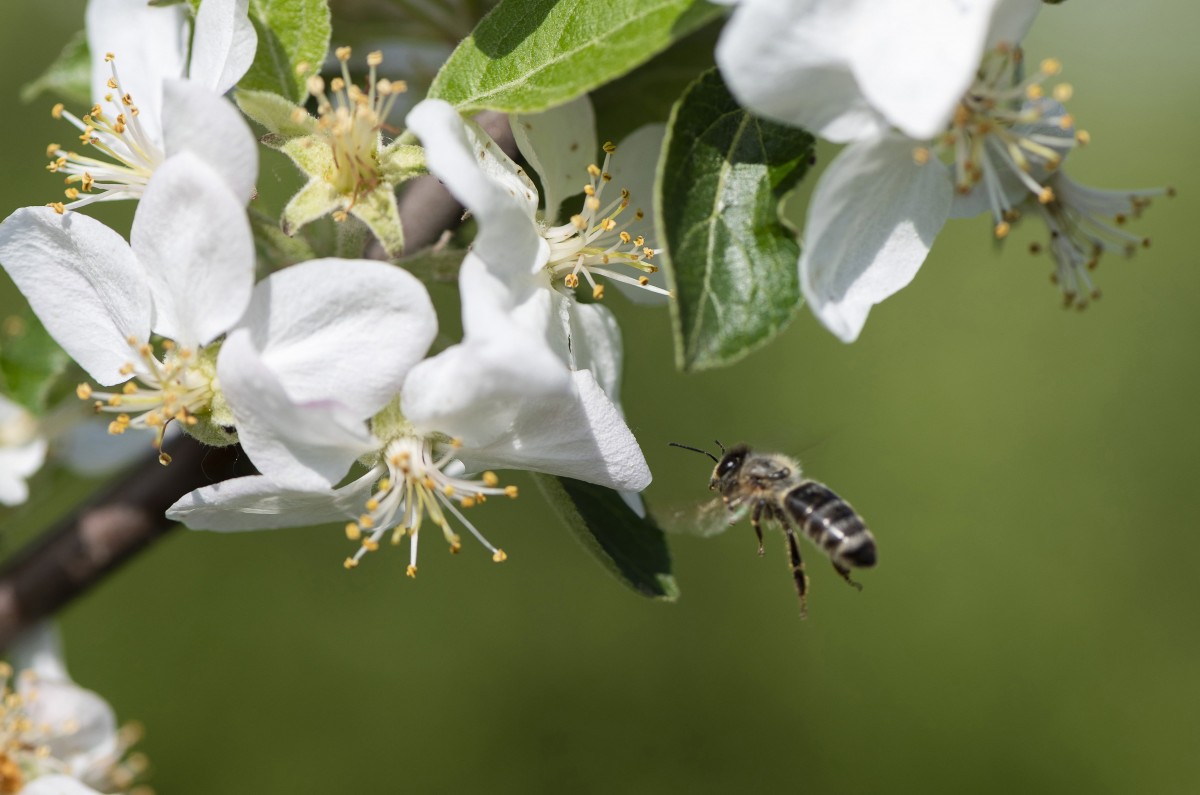 Méh száll egy almavirágra a Debreceni Egyetem Újfehértói Kutatóintézetében 2021. május 12-én.