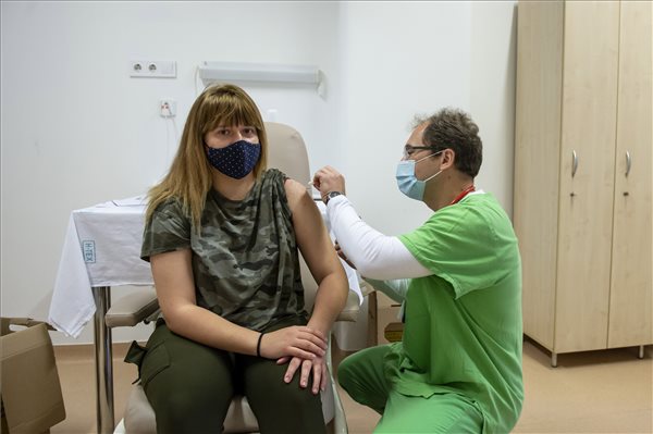 Puja Sándor gyermekorvos beolt egy fiatalt a német-amerikai fejlesztésű Pfizer-BioNTech koronavírus elleni oltóanyag, a Comirnaty-vakcina első adagjával az egri Markhot Ferenc Kórházban kialakított oltóponton 2021. május 14-én. Országszerte 101 kórházi oltóponton oltják azokat a 16-18 éveseket, akik már regisztráltak és időpontot is foglaltak. MTI/Komka Péter