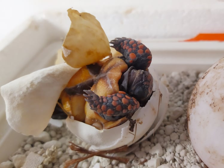 A fiókának a kikeléskor még sérülékeny a hasi oldala. Amíg a tápanyagot biztosító szikzacskó duzzadt, addig a hasi páncélja sem záródik. Pár nap eltelte után azonban felerősödik a gondozók által hüllőovinak nevezett helyiségben cseperedő teknős, melyet csak később mutatnak be a látogatóknak.