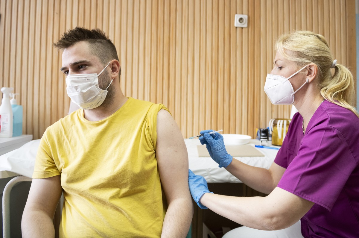 Spiró Melinda szájsebész szakorvos beolt egy férfit a német-amerikai fejlesztésű Pfizer-BioNTech koronavírus elleni oltóanyag, a Comirnaty-vakcina első adagjával a Jósa András Oktatókórházban kialakított oltóponton Nyíregyházán2021. május 22-én.