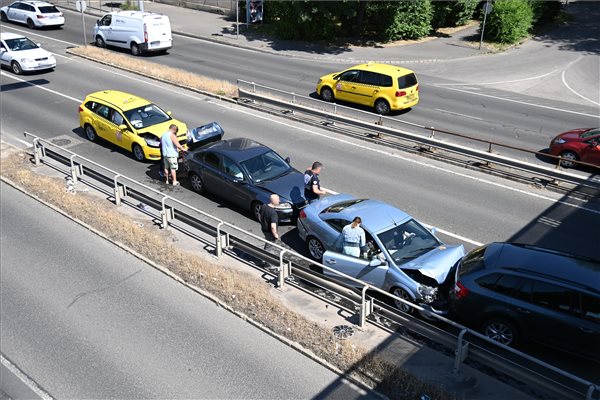 Tömeges koccanásban és ráfutásban megsérült autók a ferihegyi gyorsforgalmi útra vezető felüljárónál 2021. június 14-én. A balesetben hét autó sérült meg. Személyi sérülés nem történt.