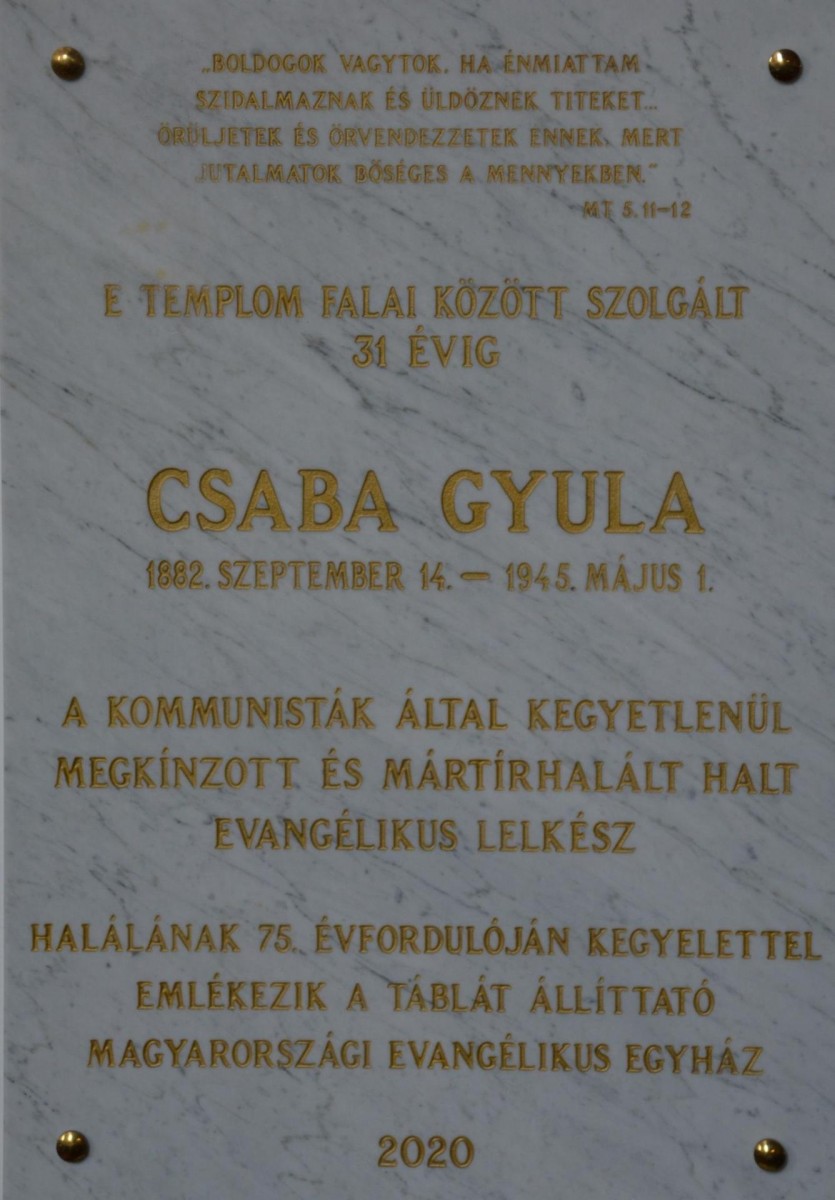 1945. május 1-jére virradóra Csaba Gyula evangélikus lelkipásztor szemét kiszúrták, nyelvét kitépték, testét megbecstelenítették, végül keresztre feszítették, más források szerint agyonlőtték. A mártír lelkész holtteste soha nem került elő. Emlékére még tavaly, halálának hetvenötödik évfordulójára készíttetett emléktáblát a Magyarországi Evangélikus Egyház (MEE). A járvány miatt ezt csak idén tudták kihelyezni Péteriben, június 20-án, vasárnap pedig Fabiny Tamás elnök-püspök jelenlétében adták át és koszorúzták meg.