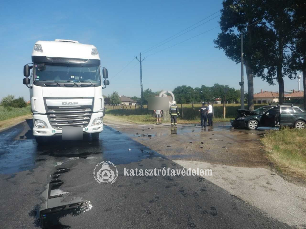 Személygépkocsi és egy kamion ütközött össze hétfőn délelőtt a 4-es főút 67-es kilométerénél, Cegléd közelében.