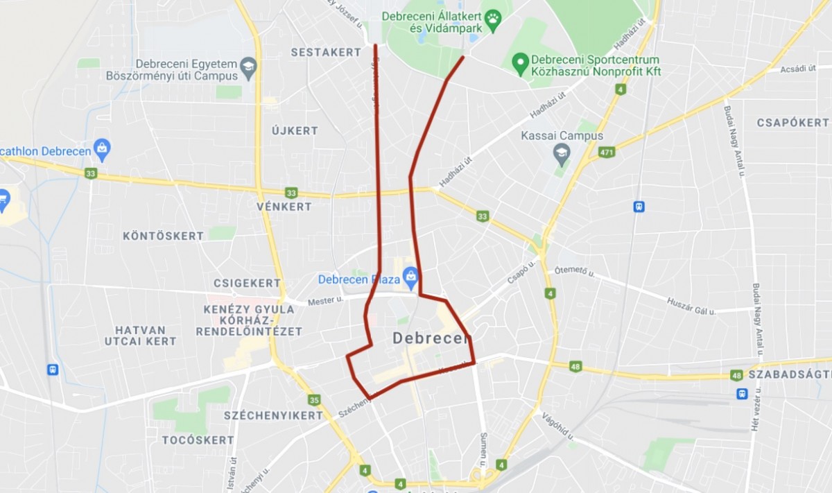 az Egyetem tér – Egyetem sugárút – Bethlen utca – Hatvan utca – Tisza István körút- Széchenyi utca – Kossuth utca – Burgundia utca – Rákóczi utca – Péterfia utca – Simonyi út – Pallagi út – II. János Pál Pápa tér útvonalon.